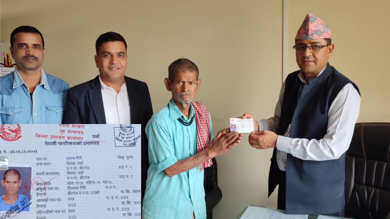 बिरगंज महानगर पालिका वडा नम्बर १ निवासी दशरथ गिरि नेपाली नागरिकताको प्रमाणपत्रबाट बन्चित थिए । नेपाली नागरिकता नहुदा उनी नेपाल सरकारबाट पाउने सबै सुबिधाबाट बन्चित थिए । लामो संघर्ष पछी गिरिले जिल्ला प्रशासन कार्यालय पर्साबाट घरमा बसेर पेन्सन खाने उमेरमा नागरिकता पाएका छन । नागरिकतामा उल्लेख भए अनुसार उनको जन्म बिक्रम सम्बत १९९४ साल बैशाख १५ गते भएको थियो जन्म मिति अनुसार उनको उमेर ८७ बर्ष भयो । गिरिले ७० बर्षको उमेरबाट पेन्सन पाउनुपर्ने थियो तर नागरिकता नभएको कारण पेन्सन सहित सम्पुर्ण सरकारी सुबिधाबाट बन्चित थिए । जिल्ला प्रशासन कार्यालय पर्साबाट आज मिति २०८१ साल बैशाख २७ गते ना प्र नम्बर ३४ -०१-८१ -०१०२१ प्राप्त गरेका छन ।