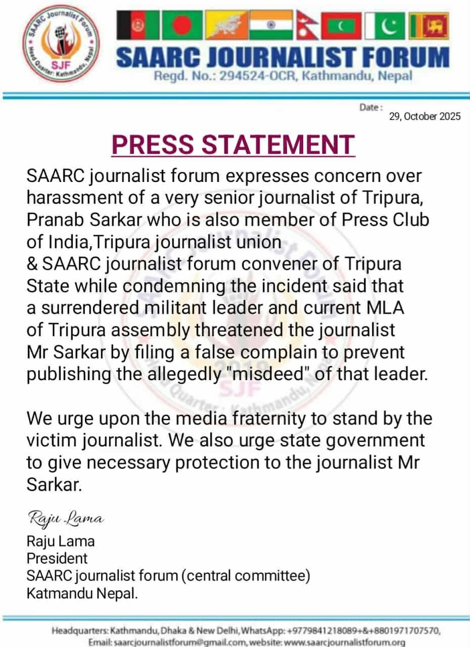 सार्क पत्रकार त्रिपुराका वरिष्ठ पत्रकार प्रणब सरकारमाथि भएको दुर्व्यवहारप्रति आपत्ति जनाएको छ। फोरमका अध्यक्ष राजु लामाका अनुसार आत्मसमर्पण गरेका पूर्व विद्रोही नेता तथा हाल त्रिपुरा विधानसभाका सदस्यले पत्रकार सरकारमाथि झूटो उजुरी दर्ता गरी धम्की दिएका हुन्।
