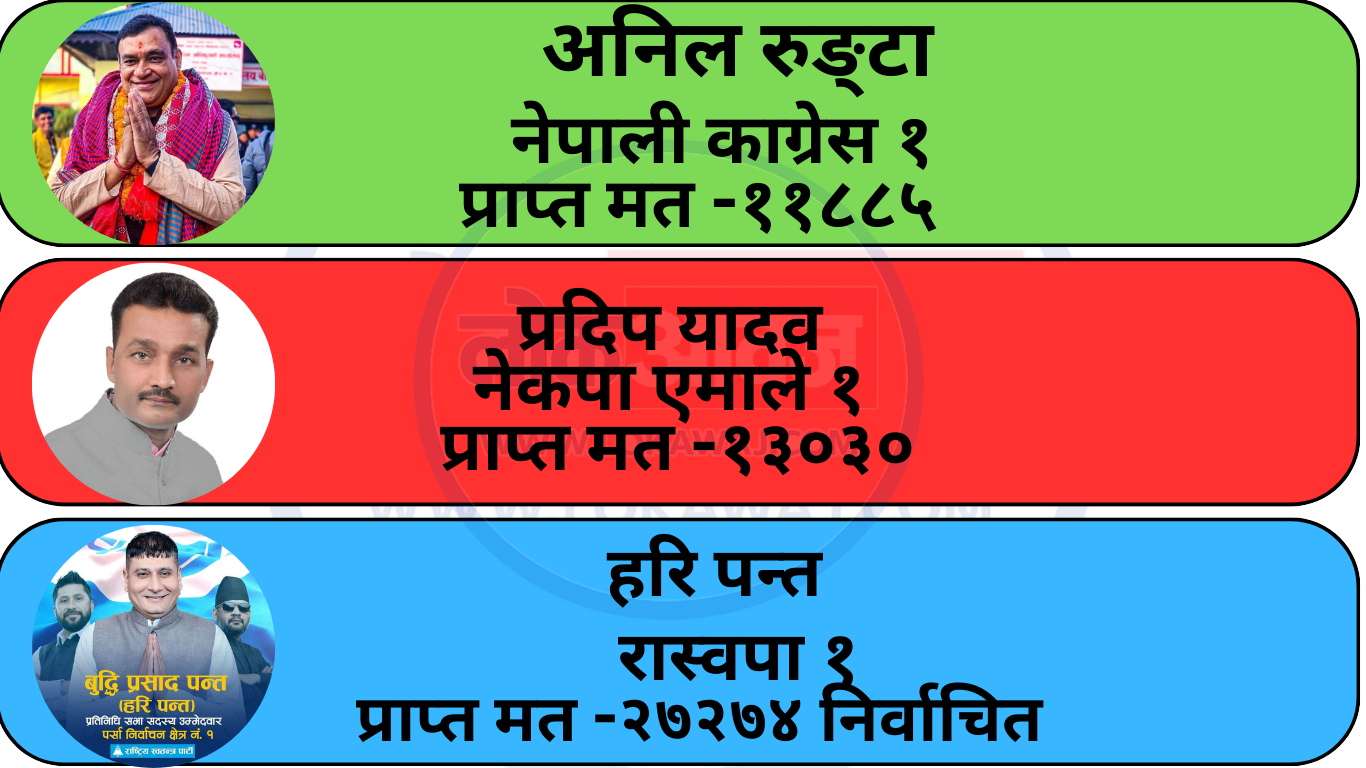 वीरगंज २३ फागुन । पर्सा जिल्लाका चारवटै प्रतिनिधिसभा निर्वाचन क्षेत्रमा राष्ट्रिय स्वतन्त्र पार्टी (रास्वपा) को अग्रता कायमै रहेको छ। जारी मतगणनाको पछिल्लो परिणामअनुसार क्षेत्र नम्बर १ मा रास्वपाका बुद्धिप्रसाद पन्त २७ हजार २७४ मत प्राप्त गर्दै निर्वाचित भएका छन्।