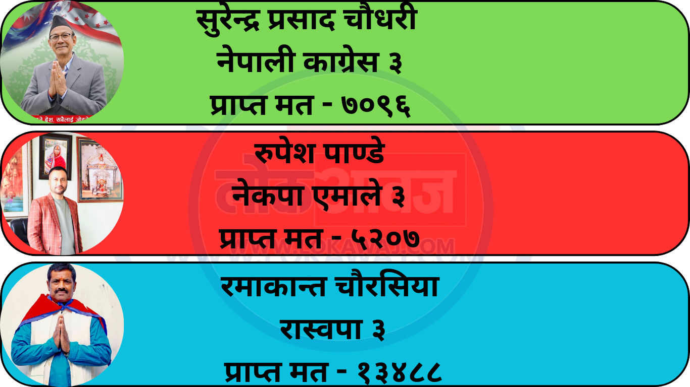 पर्सा क्षेत्र नम्बर ३ मा पनि रास्वपाका रमाकान्त चौरसिया १३ हजार ४८८ मतसहित अग्रस्थानमा छन्। नेपाली कांग्रेसका सुरेन्द्र चौधरीले ७ हजार ९६ मत ल्याएका छन् भने नेकपा एमालेका रुपेश पाण्डेले ५ हजार २०७ मत प्राप्त गरेका छन्।