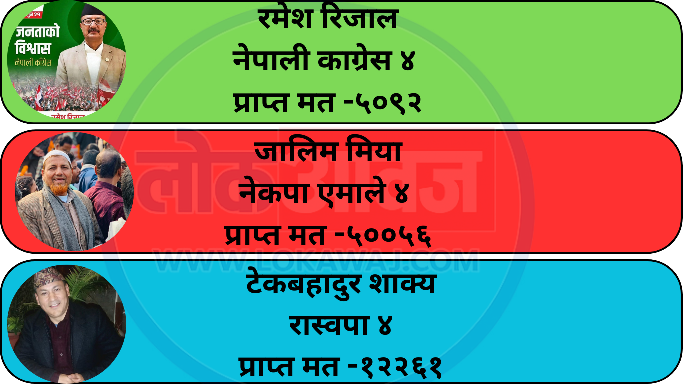 त्यस्तै पर्सा क्षेत्र नम्बर ४ मा रास्वपाका टेकबहादुर शाक्य १२ हजार २६१ मतसहित अग्रस्थानमा रहेका छन्। नेपाली कांग्रेसका रमेश रिजालले ५ हजार ९२ मत ल्याएका छन् भने नेकपा एमालेका जालिम मियाँले ५ हजार ५६ मत प्राप्त गर्दै पछाडि रहेका छन्।